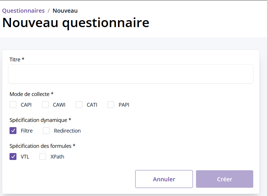 En cliquant sur le bouton, on ouvre la fenêtre de création du questionnaire. Celle-ci permet de renseigner ses paramètres.