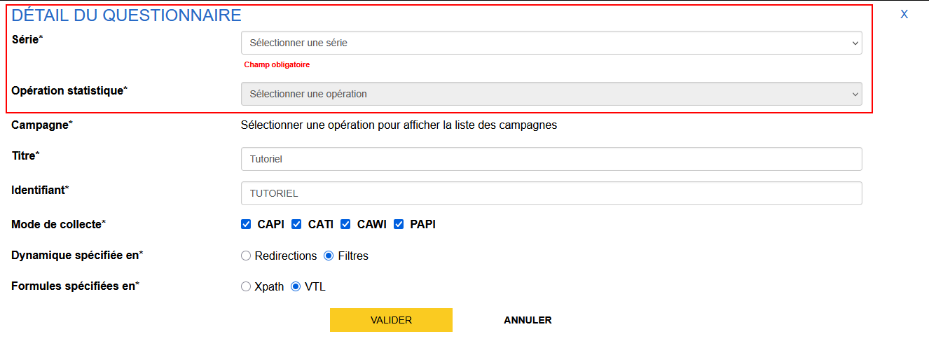 Les champs "Série", "Opération statistique" et "Campagne" sont remplis en fonction de l'enquête correspondante.