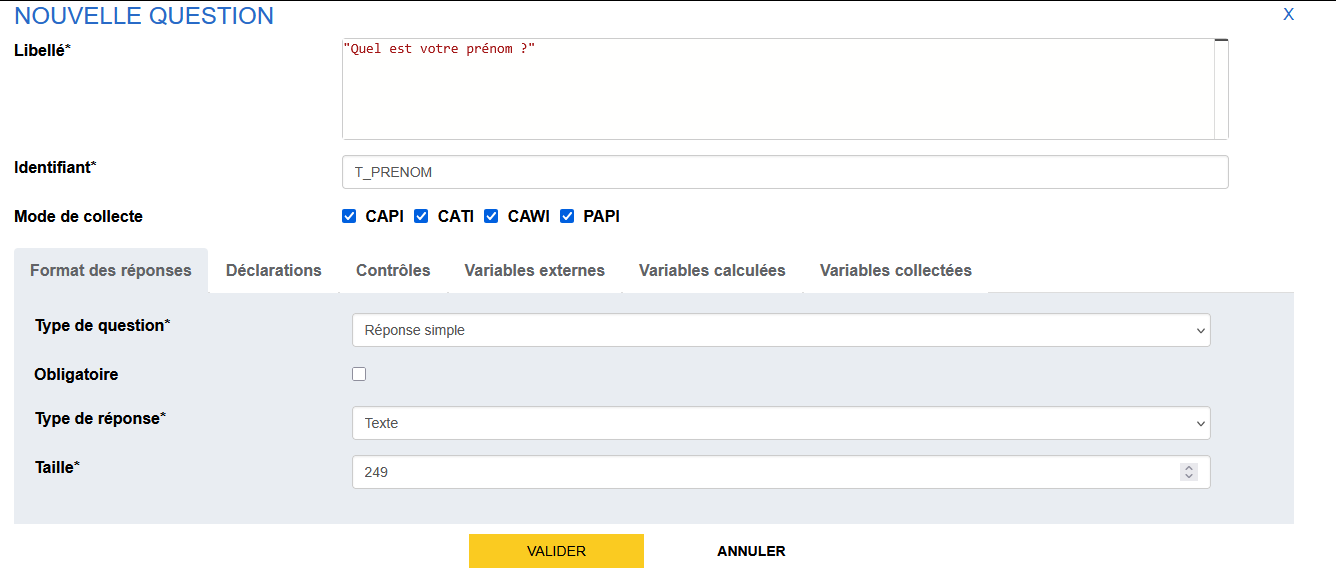 Nous allons créer maintenant une question simple, T_DATENAIS, mais avec un nouveau type de réponse, le type "Date".