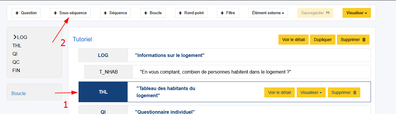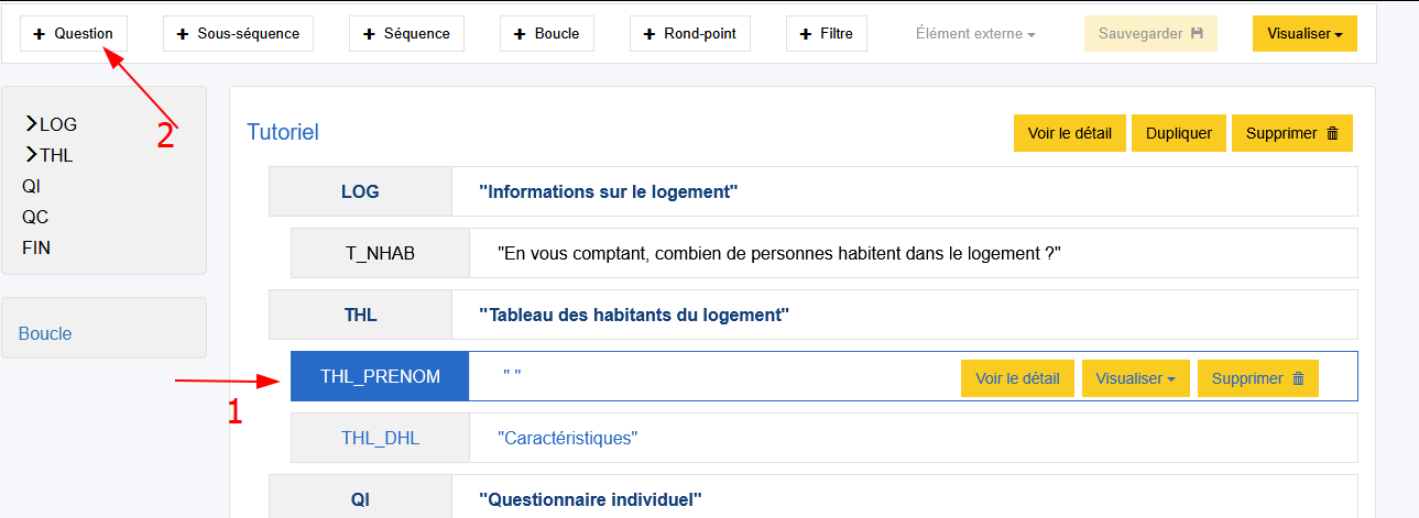 Nous poursuivons la construction du questionnaire en spécifiant les questions de la séquence sur le "Tableau des habitants du logement". Pour rappel, la composition de cette séquence ressemble à ça :