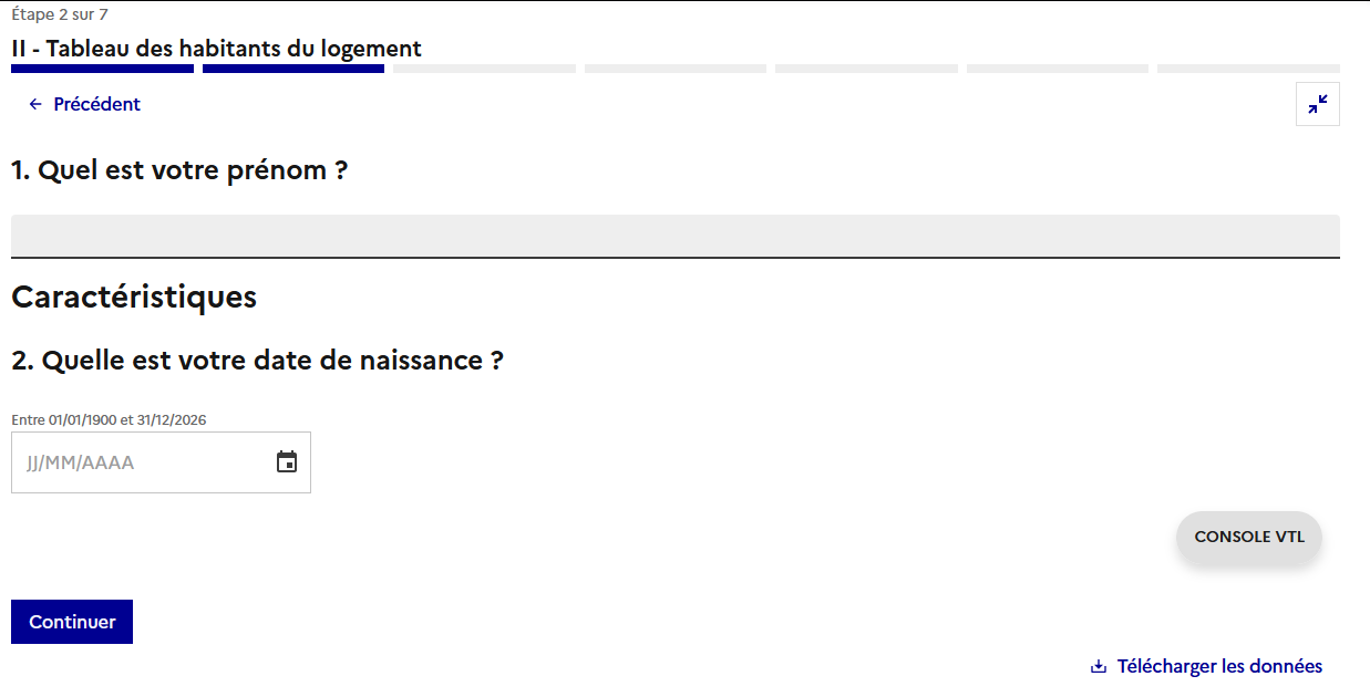 BOUCLE_INDIVbasé surBOUCLE_PRENOMSpermettant de poser une série de questions sur l'État civil de chaque individu du ménage.