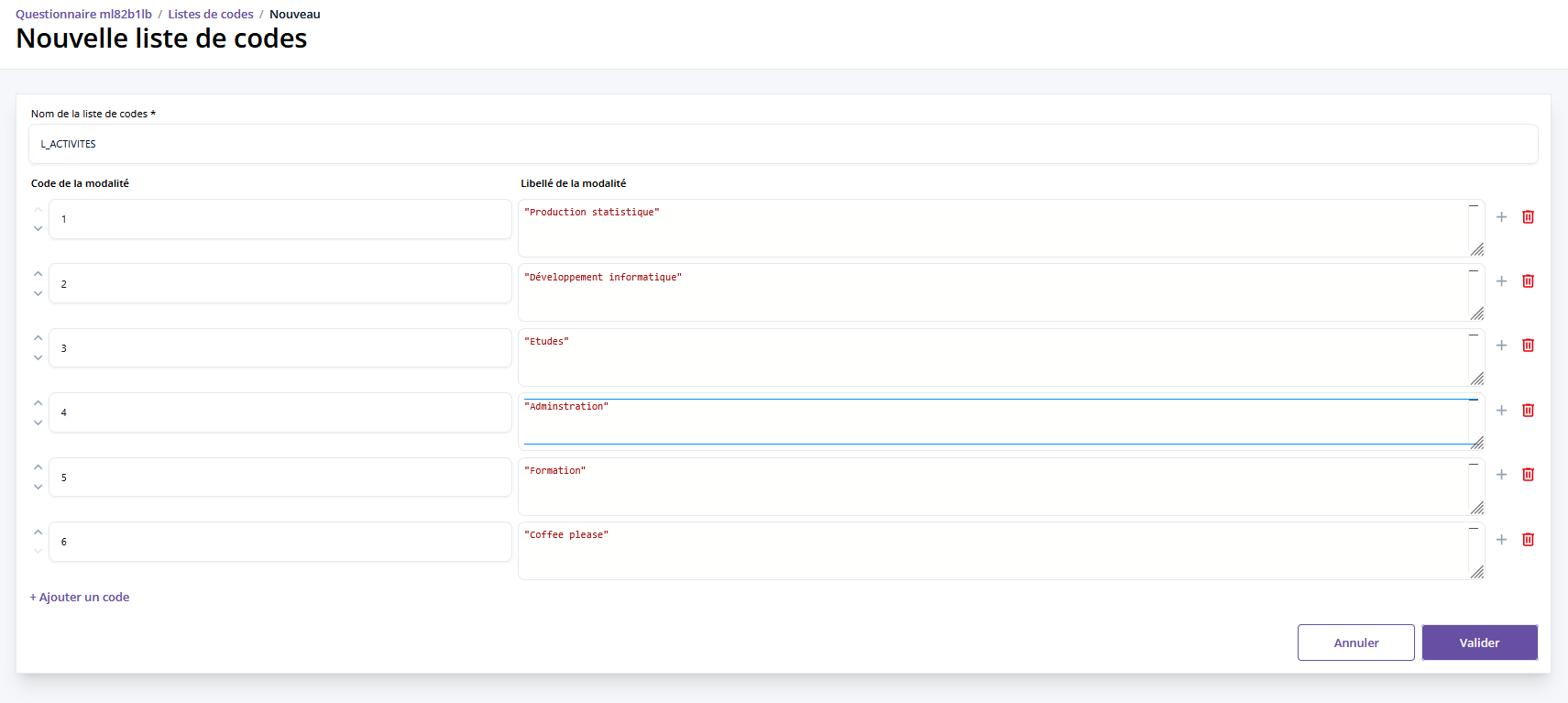 La prochaine question se présente sous la forme d'un tableau dans lequel nous allons capter la ventilation des activités de la personne que l'on interroge à partir d'une liste de modalités L_ACTIVITES à créer dans l'onglet des listes de codes.