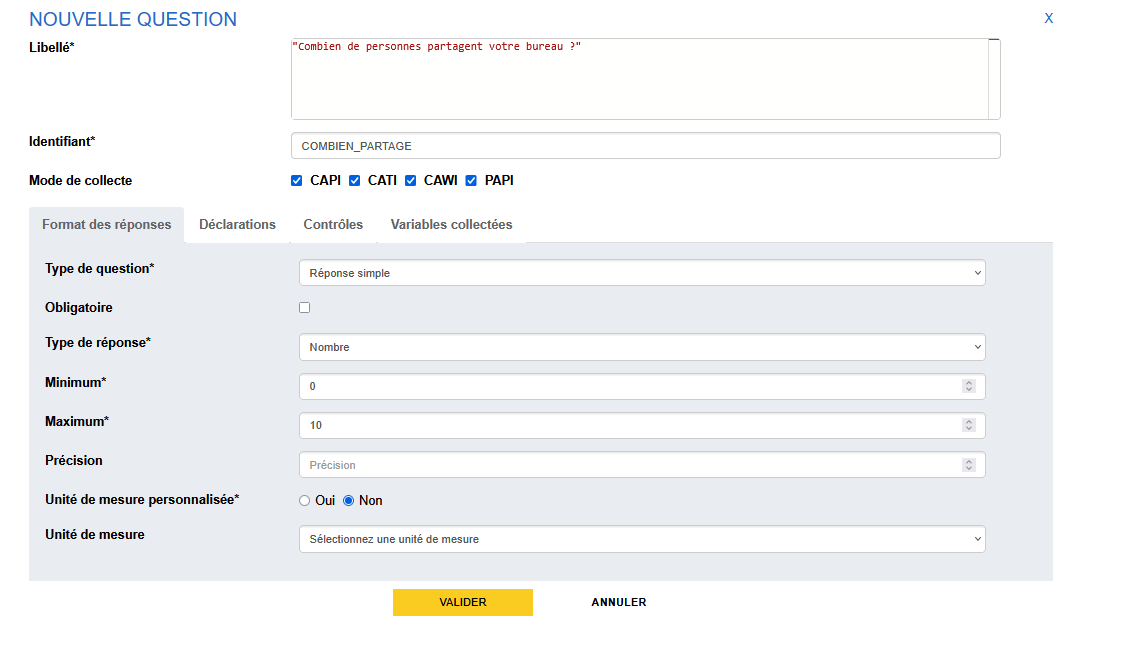 - Type de réponse "Nombre" avec un min à 0 et un max à 100
