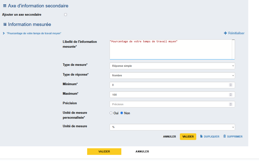 On remplit donc le Libellé de l'information mesurée avec "Pourcentage de votre temps de travail moyen" (ce sera le titre de la colonne), puis l'on choisit :