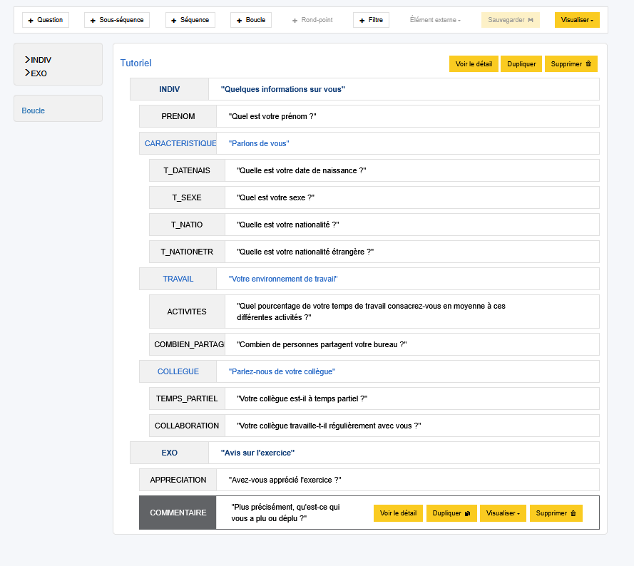 Vous pouvez maintenant créer en autonomie en question qui manquent : TEMPS_PARTIEL, COLLABORATION, APPRECIATION et COMMENTAIRE. N'oubliez pas au préalable de créer la liste de codes L_OUI_NON pour les questions de type QCU Oui-Non (TEMPS_PARTIEL, COLLABORATION et APPRECIATION).