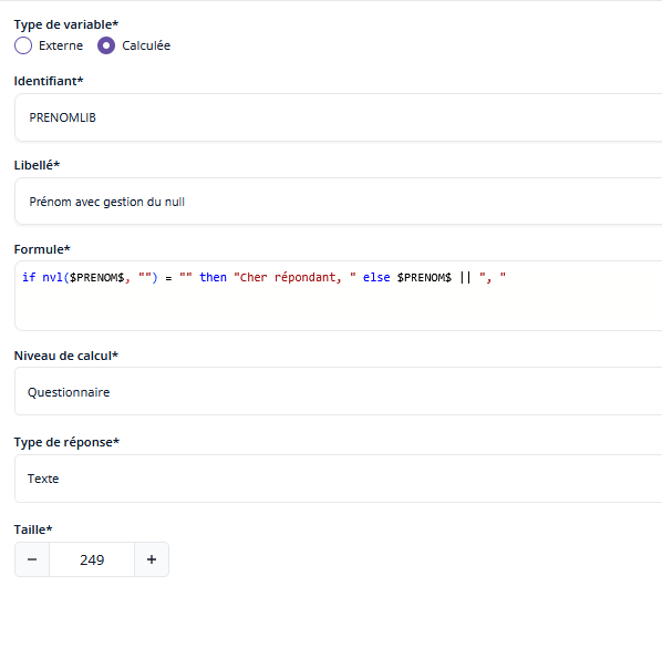 Comme précédemment, au sein d'une question, dans l'onglet Variables calculées, on crée la variable PRENOMLIB dont la valeur est :