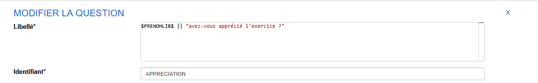 On peut retourner sur la question dont l'identifiant est APPRECIATION, pour modifier son libellé de manière à commencer par le texte produit par la variable PRENOMLIB.