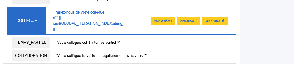En visualisant notre questionnaire par exemple en web ménage, on remarque qu'il est difficile de différencier les itérations des différents collègues : ajoutons un peu de personnalisation à la boucle.