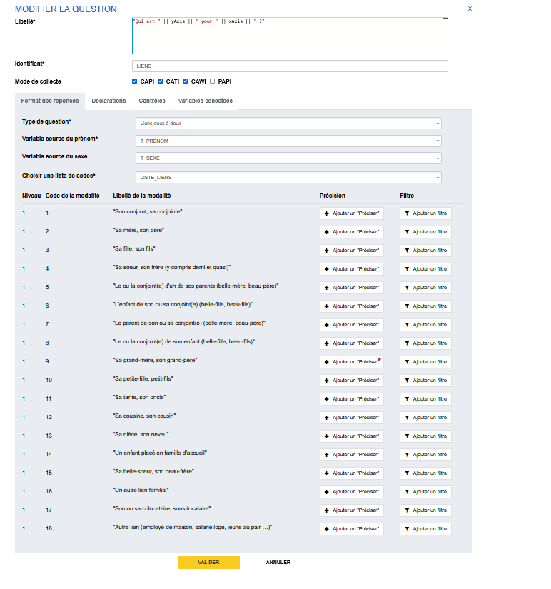 Ce type de question est aujourd'hui exclusivement réservée au tronc commun des ménages : elle permet de collecter les liens familiaux entre les différents habitants du logement. Elle se compose d'un ensemble de "listes déroulantes" demandant les liens entre tous les habitants du logement.