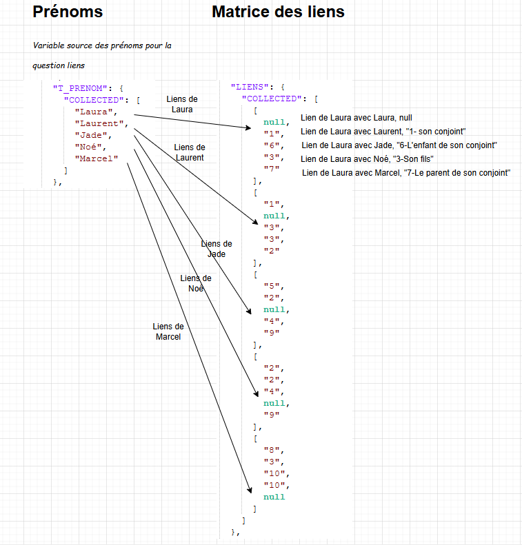 Le format des données collectées lors d'une question de type lien deux à deux ne permet pas à ce jour de mobiliser simplement, en cours de collecte chaque lien, c'est pourquoi on met à votre disposition des variables globales permettant de mobiliser les principales informations utiles au questionnement (prénom et sexe des parents, prénom du conjoint, liste des prénoms des enfants).