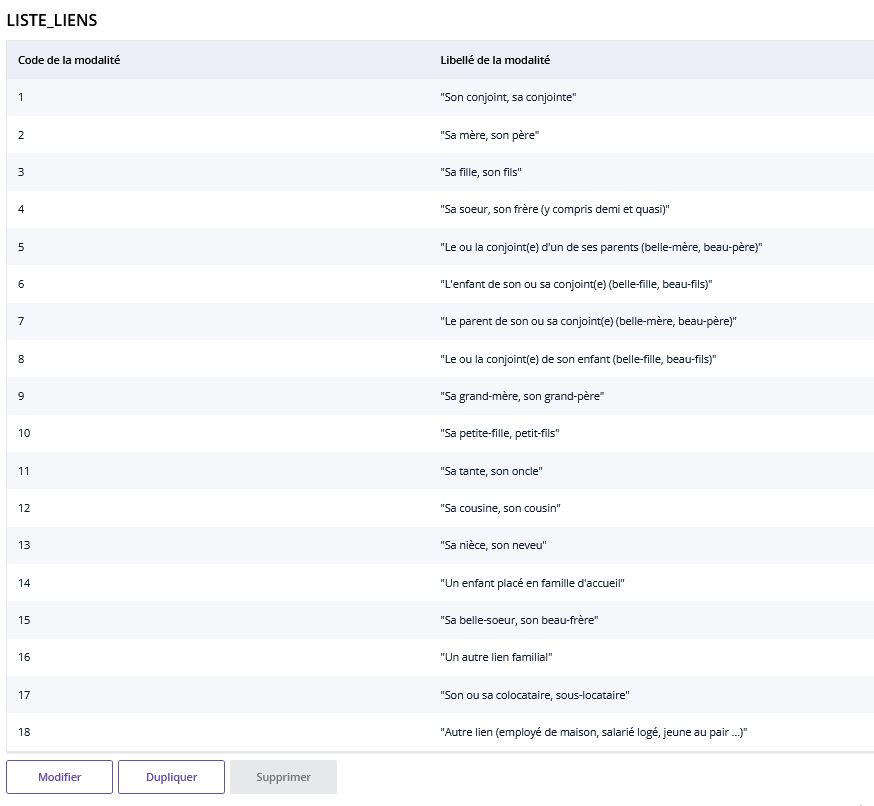 La liste de codes à utiliser pour les liens entre les habitants du logement est maintenue par la division RTI et en partie internalisée dans les outils de l'atelier pour la fouriture des liens réciproques. Il est impératif de l'utiliser sans modifications.